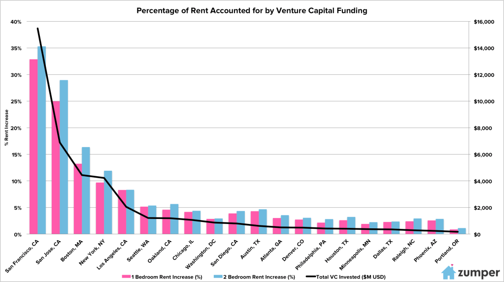 Zumper, a venture-backed startup that focuses on creating a more efficient and transparent apartment rental marketplace, ran a study of housing costs in tech hubs across the United States. They’re arguing that one-third of San Francisco’s rents are attributable to venture capital funding.