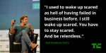“You’ve got to be relentless. You need a healthy enthusiasm for all your great ideas and be impatient as hell to bring them to reality. Having failed a business before scared the hell out of me. You can never say ‘we made it.’ That’s when you get hit by the competitor trucks,” Woodman said. “If you don’t feel like you’re relentless, chances are you’re competing with somebody who is.”