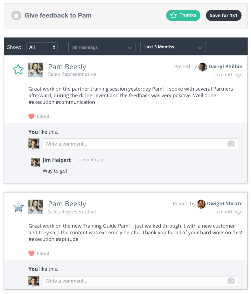 With a pop up tab that appears in the body of an email, a colleague can provide feedback about what someone did particularly well any time they’re moved to do so. Meanwhile, managers can use the field any time they like to deliver constructive feedback.