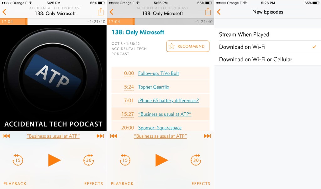 In addition to making the app free, There are a few new features in Overcast 2.0, starting with streaming. There are now three settings as you can see in the top screenshot. You can download every episode on Wi-Fi, download every episode on Wi-Fi and cellular or stream every episode. If you choose the last option, new episodes won’t download automatically.