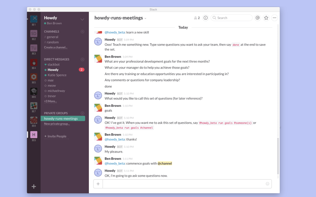 Howdy is first and foremost a time saver for now, especially when it comes to meetings. For example, after connecting to Slack, the app can simultaneously message each member of a team, collecting status updates that can be archived and viewed by everyone. The idea: to keep meetings from turning into one long catch-up session and enabling attendees to focus on decision-making instead. (Worth noting: Howdy can also be used to collect everyone’s lunch orders. It’s up to the team using it.)