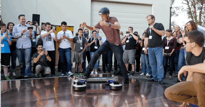 Thanks to hands-on feedback from skateboarding legend Tony Hawk, it no longer looks like “a lunch tray”, as he said. The Hendo now has a skateboard deck on the top with the motors flung out to the sides so it’s more obviously a board that basically flies. Arx Pax co-founder Greg Henderson says “Getting Tony’s feedback made a huge difference in our design approach.” Hawk was on hand at today’s unveiling in Los Gatos, California. He made riding the Hendo 2 look easy, as you can see in the GIF above.