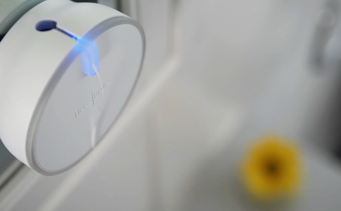 Flosstime sits on the mirror of the bathroom and dispenses the right amount of floss when you press a button, lighting up to show a blue smile. When you don’t press the button, and thus don’t floss, for a few days, the Flosstime lights turn orange and go into a frown.