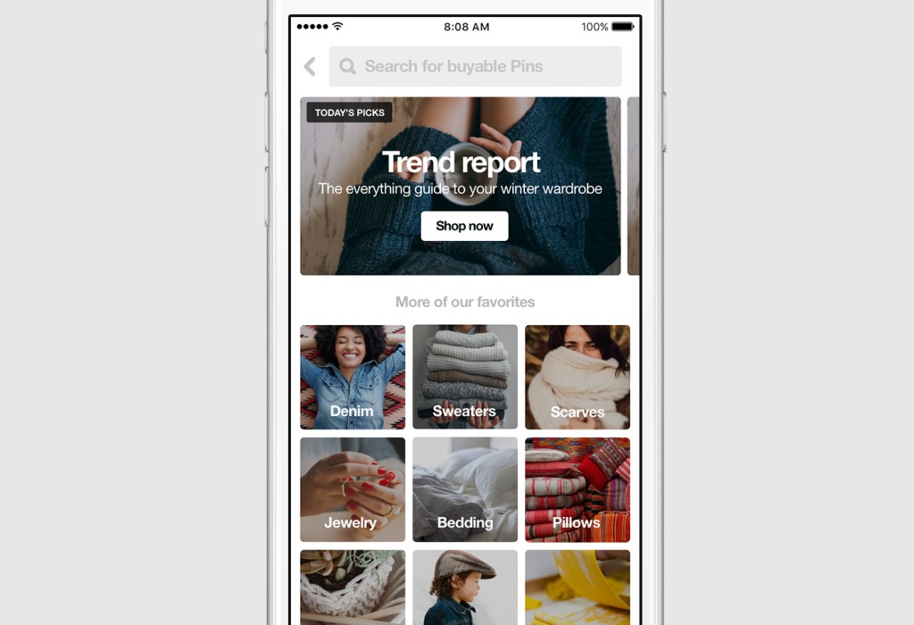 Beyond that, the company is today rolling out what it is called the Pinterest Shop, which is a collection of trending products that users can buy on Pinterest. Examples would be products that fall under topics like sweaters and pillows. Some of Pinterest’s top trends, according to the company, were leather leggings and blanket scarves, which fall into the company’s trend report as part of its shop.