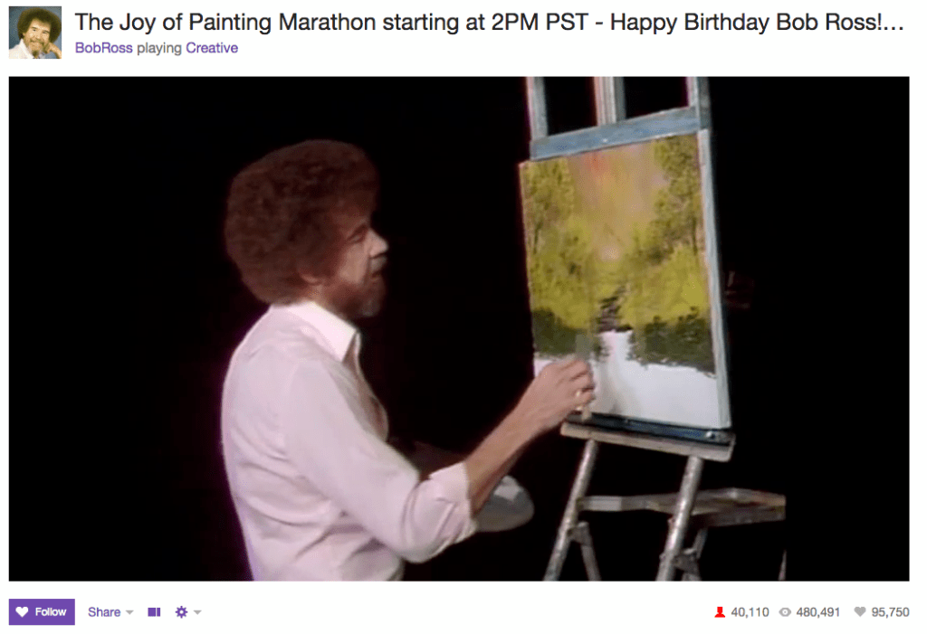 Twitch gained the rights to live-stream Bob Ross from BobRoss Inc. and Janson Media, whose participation helped introduce him to a younger generation of viewers who don’t remember watching his calming tutorials on painting on TV as kids.