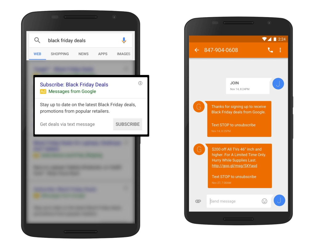 If you search for a general term like “black friday deals” from your mobile phone, you may see an option that prompts you to subscribe to alerts from a Google ad at the top of your search results. If you choose to do so, your phone number will be kept private, says Google, and you’ll be able to opt out of the text messages at any time.