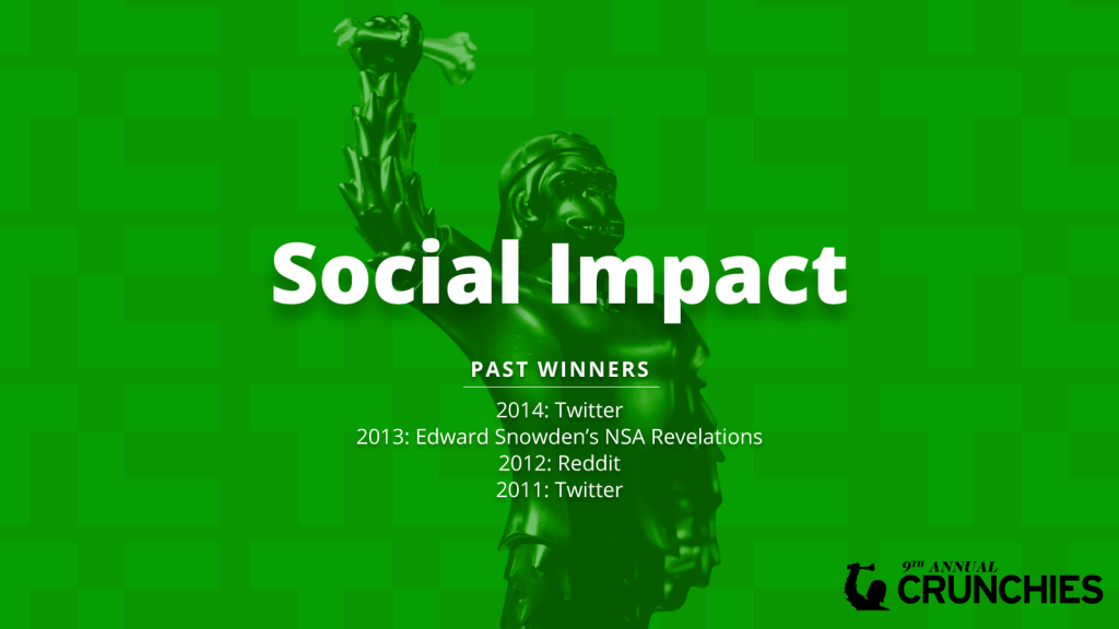 Let me tell you a bit more about what we are looking for to take home the prize! The Best Social Impact Startup winner should have excelled in using technology to effect social impact. The past four winners of this award were Twitter (2014), Edward Snowden’s NSA Revelations (2013), Reddit (2012) and Twitter (2011).