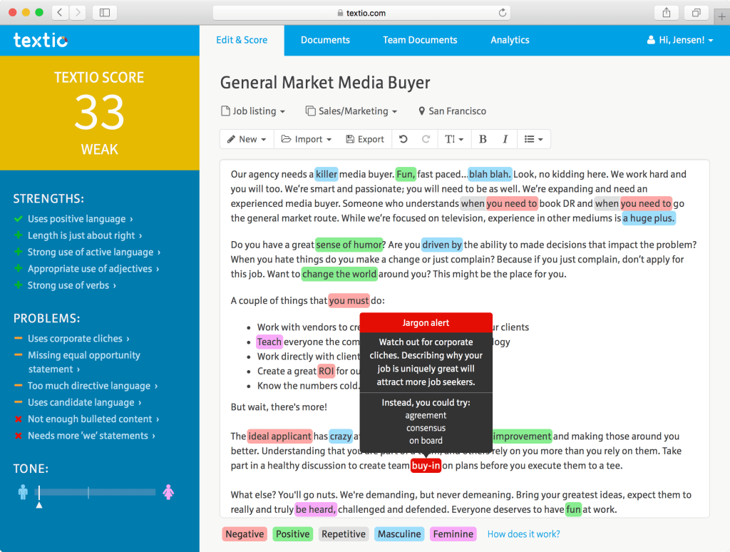 Textio’s first tool looks at talent acquisition documents — like job postings — to determine how well they will perform among candidates. Certain words and layouts attract more candidates than others, Snyder found, and those predictive analytics are baked into the service. For example, Textio shows that job postings with bullet points tend to perform better than job postings without them.