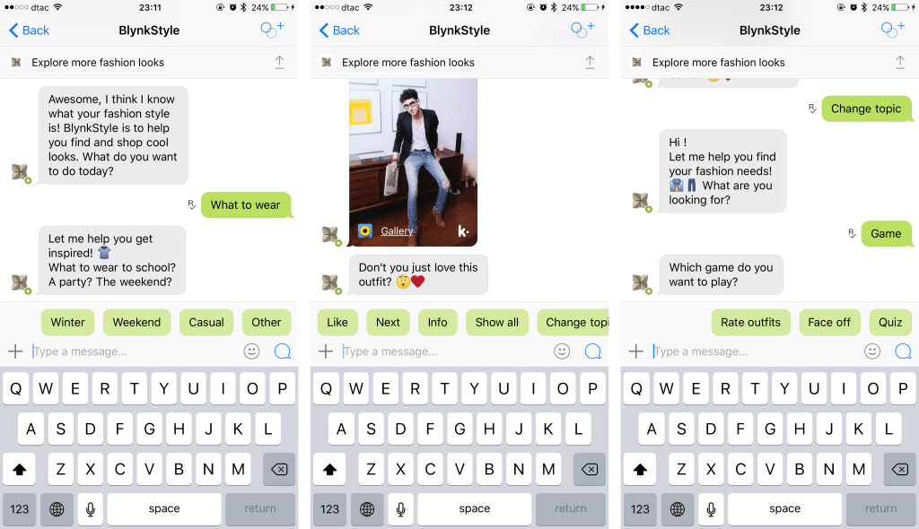 Blynk — which offers apps for iOS and Android too — is a good example of what bots, which are programmed accounts which respond to users, can do on Kik. The Blynk bot itself narrows down the kind of fashion a user is into using visual Q&A, it then helps them browse high-street catalogs, and offers other kind of entertainment all of which is hosted inside the Kik app. In other words, users can get an app and web-like experiences without leaving the messaging app.