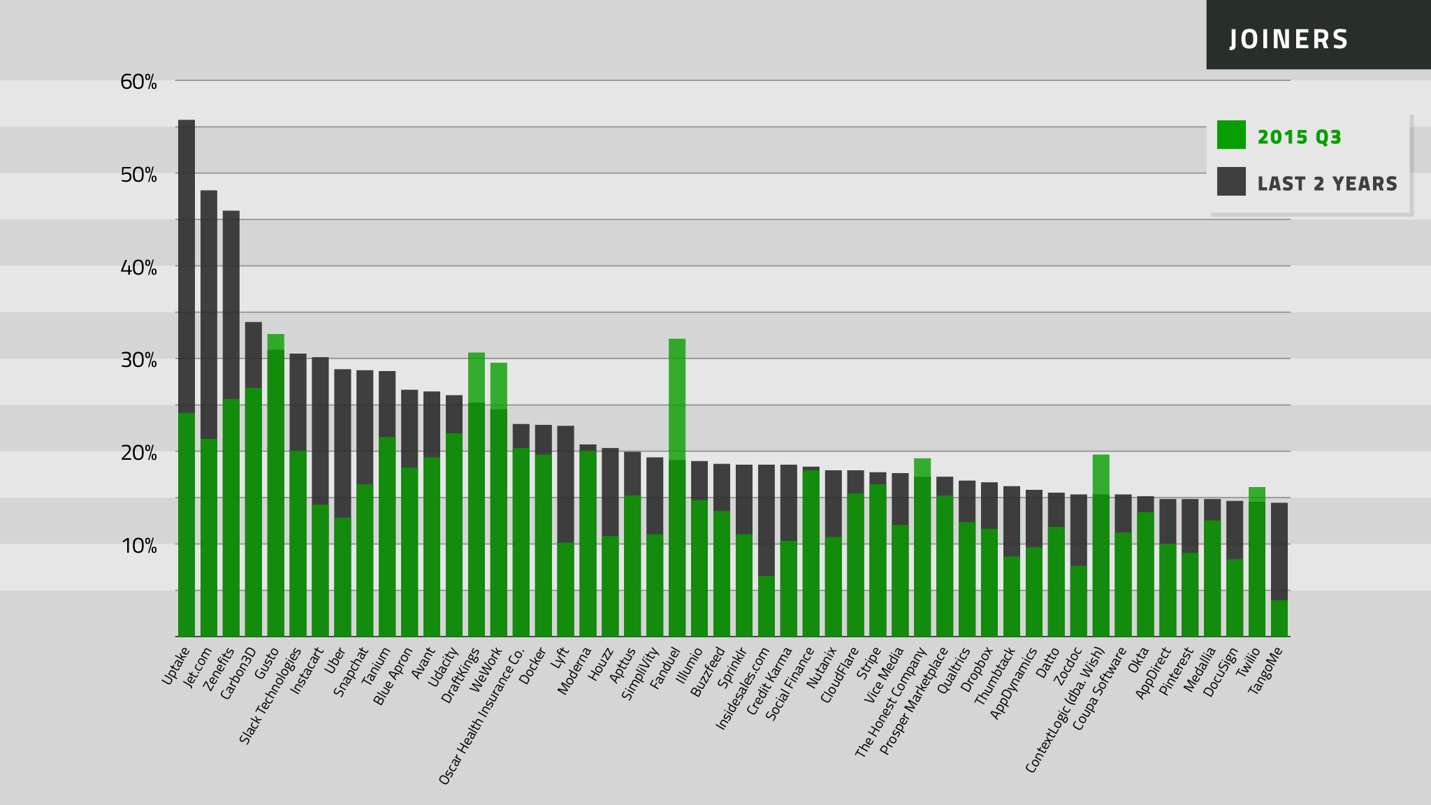 You’ll see that in some cases, the same companies appear on both lists. With Instacart, for example, you’ll see that an average of 7.8 percent of employees left each quarter over the last two years; you’ll also see that the number of new employees grew by roughly 30 percent per quarter, meaning its employees’ net growth was 22 percent. (Caldwell disputes this, saying that number is low.)