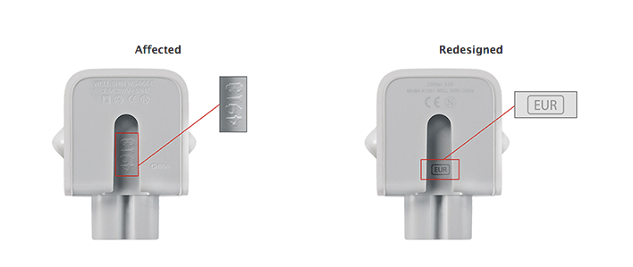 Apple is asking customers to stop using affected plug adaptors and visit http://www.apple.com/uk/support/ac-wallplug-adapter/ for details about how to exchange the affected adapters for new, redesigned ones.