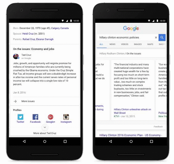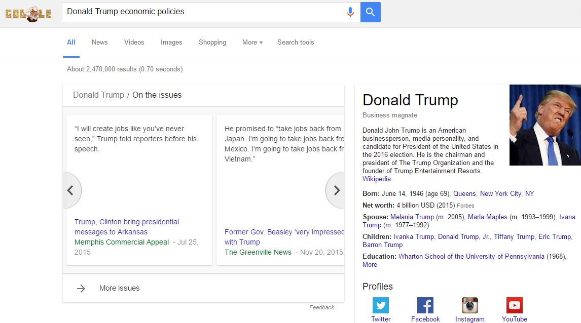 Starting today, you can just do a search for “Donald Trump economic policies” and the search results page will show a new box that highlights Trump’s policies on everything from H-1Bs to how he plans to take jobs back from Mexico (and Japan. And China). And yes – those are Trump’s plans, so they are inevitably a bit low on detail. If you want something more substantial, you can always plug in another candidate’s name (for better or worse, there are still plenty to choose from, after all).