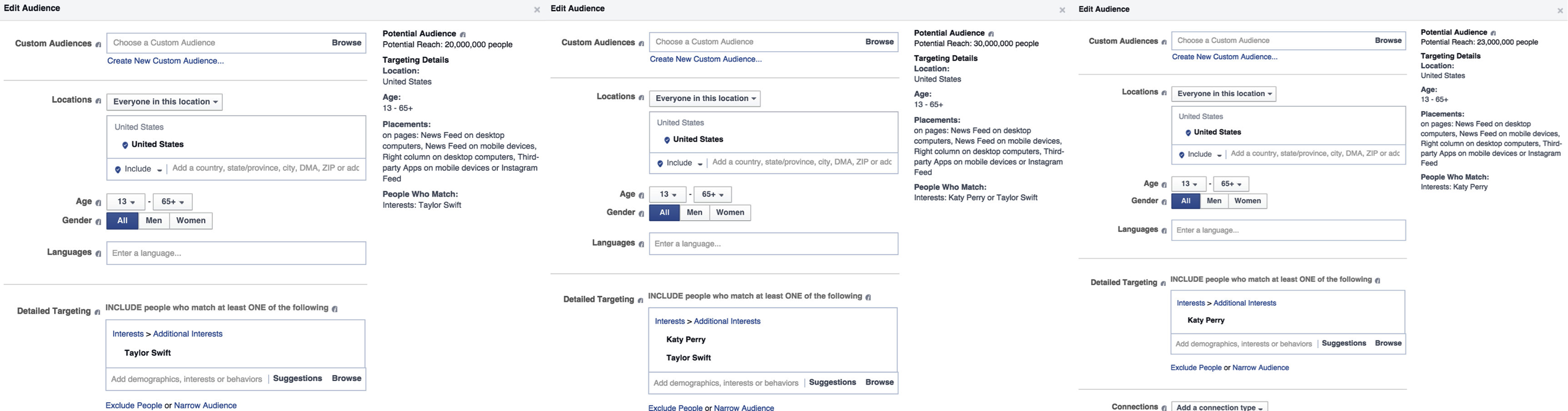 From Facebook power editor, we are going to build a new campaign, new ad set and new ad, but we’re not going to run it, this is just for research. Because all targeting in Facebook is handled at the ad-set level, go to the ad set and let’s play with targeting. In this example, I want to find out the overlap of fans of Taylor Swift and Katy Perry and the breakdown by gender.