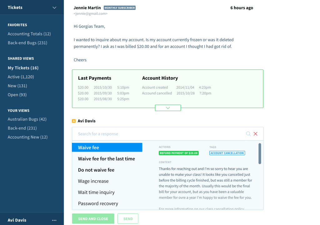 Behind the scenes, Gorgias grabs information from your CRM and e-commerce platforms so that you know everything about your customers when they contact you. Then, Gorgias analyzes the request to suggest canned answers. You can also create templates and shortcuts so that it auto-expands a small snippet of text into a polite support answer.
