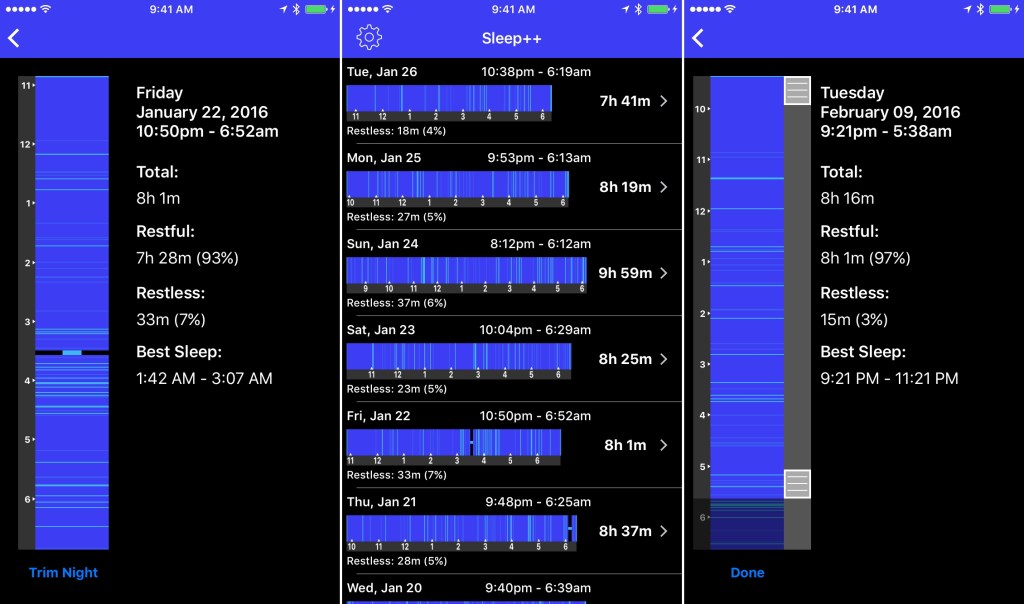 Using it isn’t too cumbersome as the Watch app only has one button — a start/stop button. Today’s update improves the sleep analysis, lets you synchronize your sleep data with the Health app and other HealthKit apps and adds the ability to trim your night if you forgot to turn Sleep++ off when you woke up.