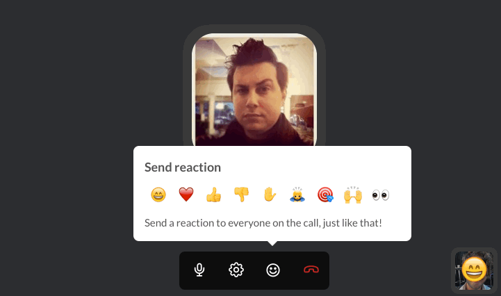 It lets you start a private Slack Call or launch a conference call in a channel that anyone can join with a click. And in keeping with Slack’s lighthearted style, once you’re chatting, you can send visual emoji reactions that appear overlaid on your profile picture to others on the call.