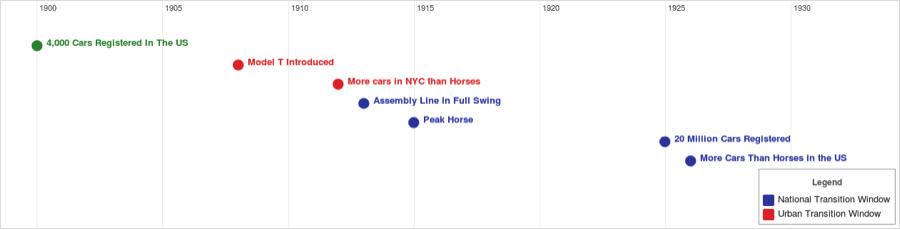 Triangulating these data points indicates two distinct transition periods: The urban transition, which occurred roughly between 1908 and 1912, and the full national transition, which began with the implementation of the assembly line in 1913 and was well underway by the early 1920s. For those playing along at home, this translates into a four-year urban transition and a 7-10 year national transition.