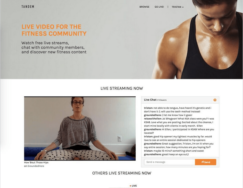 Tandem’s hope, says founder and CEO Tristan Zier, is to carve out a fitness-specific niche in a live streaming space that already has big tech platforms duking away for dominance — with Twitter’s Periscope squaring up to Facebook’s Live feature, for example. Albeit the likes of Periscope, Facebook and Meerket are not focusing on a specific live video niche as Tandem is.