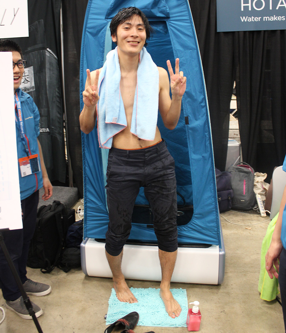 The compact shower can be easily deployed in any area. It does require a power source, but Riki and Ryo told me that you can hook it up to a car for basic power to run it (unheated water). To power the water heater, a generator or AC hookup is needed.