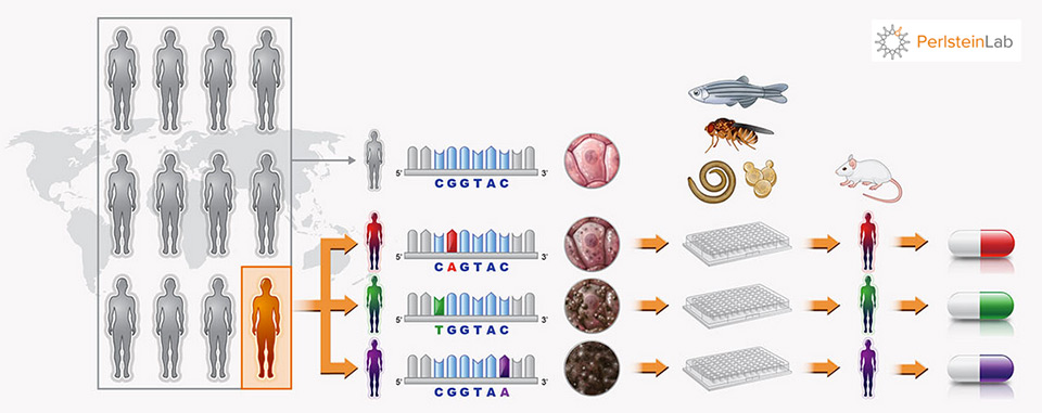 PLab focuses on single broken gene diseases initially because they are obviously less complex and easier to approach. Using a molecular apparatus known as a CRISPR—which Perlstein likened to a command line editor for animal genomes—PLab alters the genome of test animals (yeasts, flies, worms, fish and sometimes mice) to mimic the broken gene disorder…to essentially, make them ill. Because many of these animal are small, even microscopic, PLab can have large numbers of them to test against.