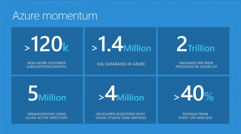 At last year’s conference, Microsoft celebrated that it had 100k new Azure customer subscriptions per month, but it today revealed that the rate of growth has accelerated further, now topping 120k new customers per month.