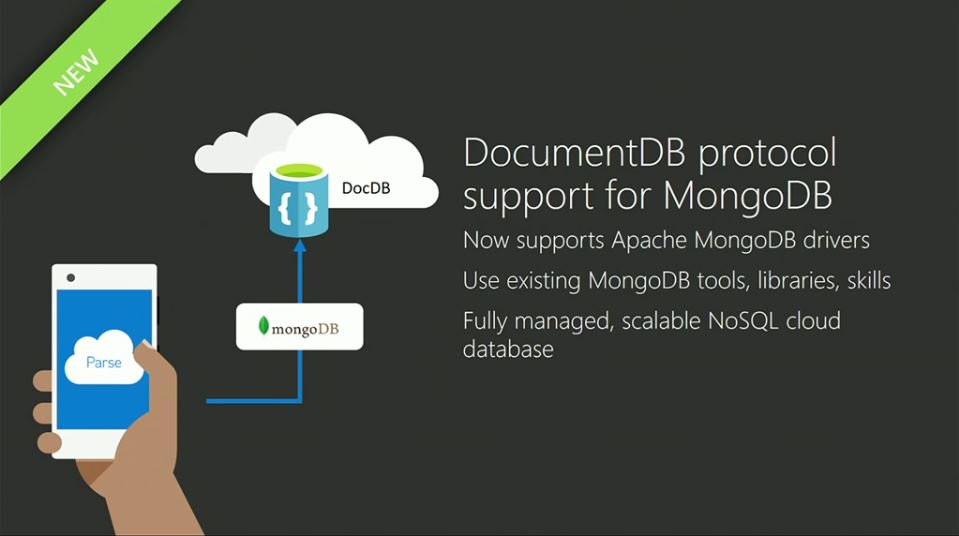 Ironically, Microsoft used Parse in one of its slides to demonstrate how you could use MongoDB support. Parse-powered apps can communicate with DocumentDB using MongoDB instructions. But Facebook is shutting down Parse. Fear not! Microsoft also lets you move your Parse server to Azure, so everything makes sense in some way.