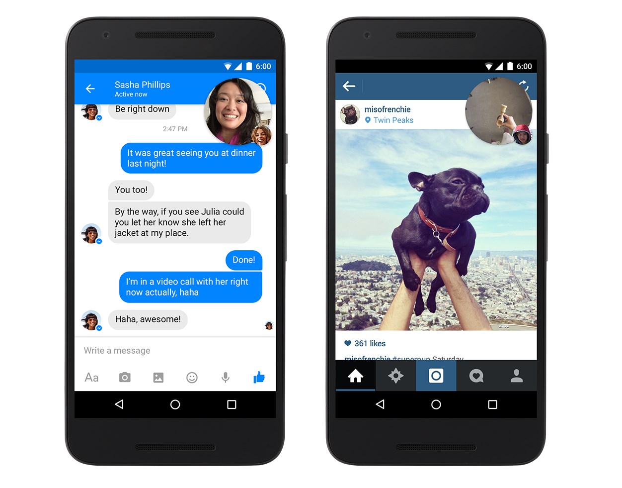 Next up: Video chat now has the option of switching to a persistent “Chat Head” interface rather than full screen. On Android, that means you’ll be able to have a floating video chat circle on-screen follow you anywhere on your phone — perhaps even to different video chat apps. iOS users will have to stay inside Messenger, sadly.