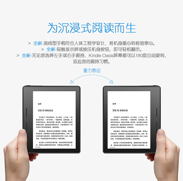 The first noticeable thing is that the new Kindle is smaller than the Kindle Voyage. With slimmer bezels, a smaller battery and a one-handed design, the Kindle Oasis only weighs 131 grams compared to 180 grams for the Kindle Voyage (27 percent lighter) and 205g for the Kindle Paperwhite (36 percent lighter). A built-in accelerometer automatically pivots the display if you switch from the left hand to the right hand.
