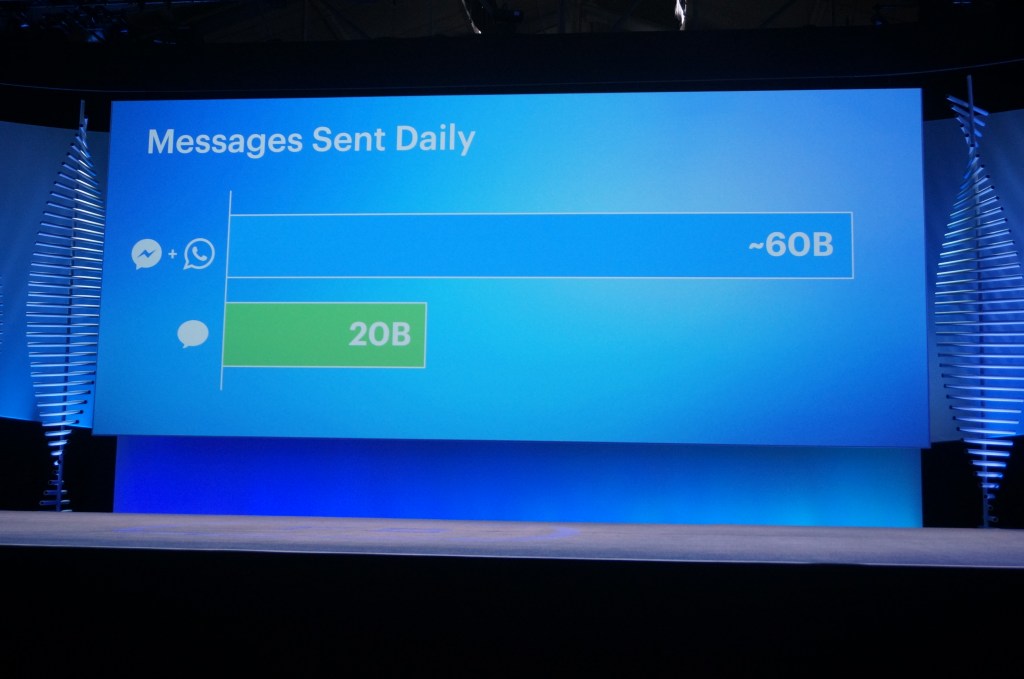 At Facebook’s F8 developers conference this morning, the company shared some interesting metrics related to the traction and growth of its popular messaging applications, Messenger and WhatsApp. One especially notable figure CEO Mark Zuckerberg unveiled was that Facebook’s two messaging services, when combined, saw more activity on a daily basis than SMS (traditional texting). That is, Messenger and WhatsApp see 60 billion messages sent daily versus 20 billion for SMS.