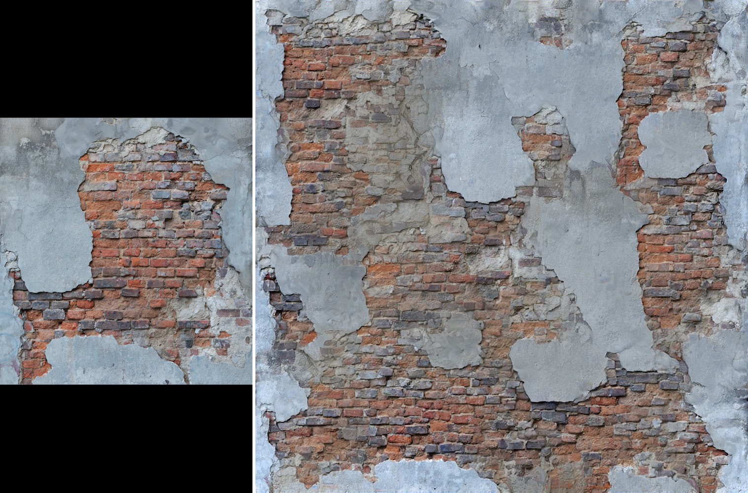 Take that brick and mortar wall at top, for instance: It’s clear there are different regions and hard borders between them, with reliable variations in color and texture. The system discovers rules that govern everything from the finest details to larger patterns, and simply makes new imagery that fits within those rules.