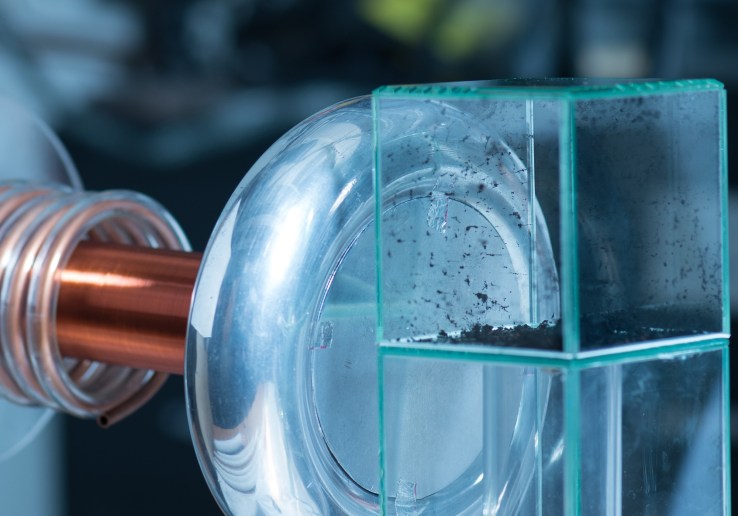 The alternating current of the coil apparently polarizes the nanotube pieces, which immediately align themselves with their neighbors and form long chains. Watch for yourself: