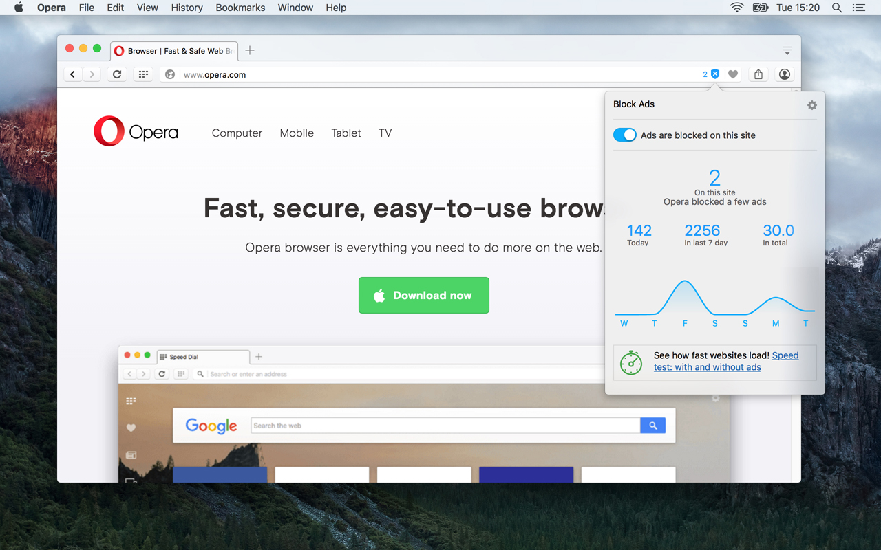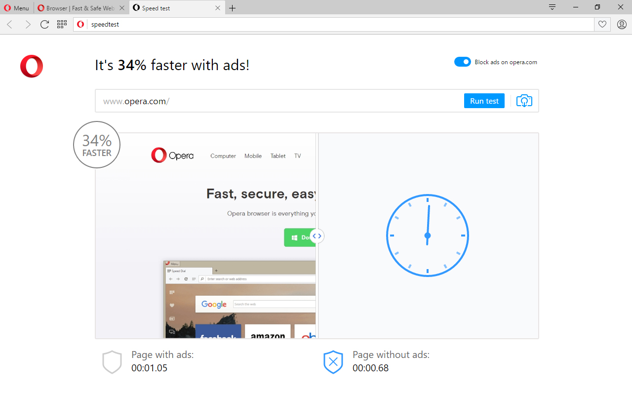 Opera argues that its built-in ad blocker is also faster than using Chrome or another browser with a third-party ad-blocking add-on. Indeed, the company argues that its solution is about 45 percent faster than using Chrome with AdBlock Plus.