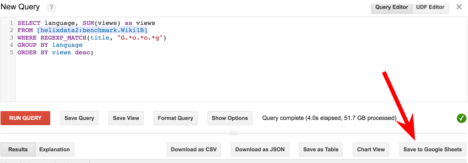 So here is what you can do now: Google will now allow BigQuery users to export results right to Google Sheets, its Excel competitor. In addition, BigQuery will also now be able to directly access files from Google Drive for analysis without having to first load them into BigQuery and the service can also directly query Google Sheets spreadsheets now as you edit them.