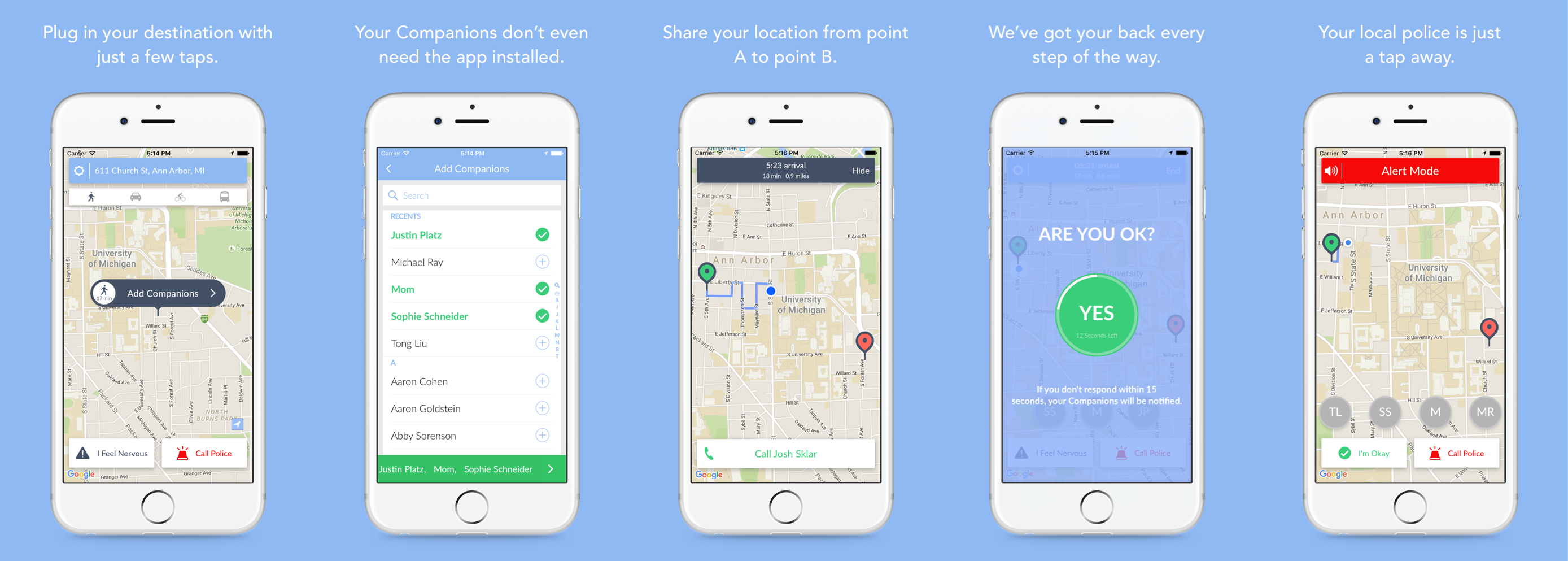 Companion serves as a virtual buddy system that allows anyone in your address book to track your path for potential safety risks in sketchy situations, like walking alone at night. Friends or family members can track your route home in real time, and users can instantly send out an alert if an emergency arises. Mobile safety communication platform LiveSafe provides a similar tech solution, SafeWalk, for virtually walking home friends and family.