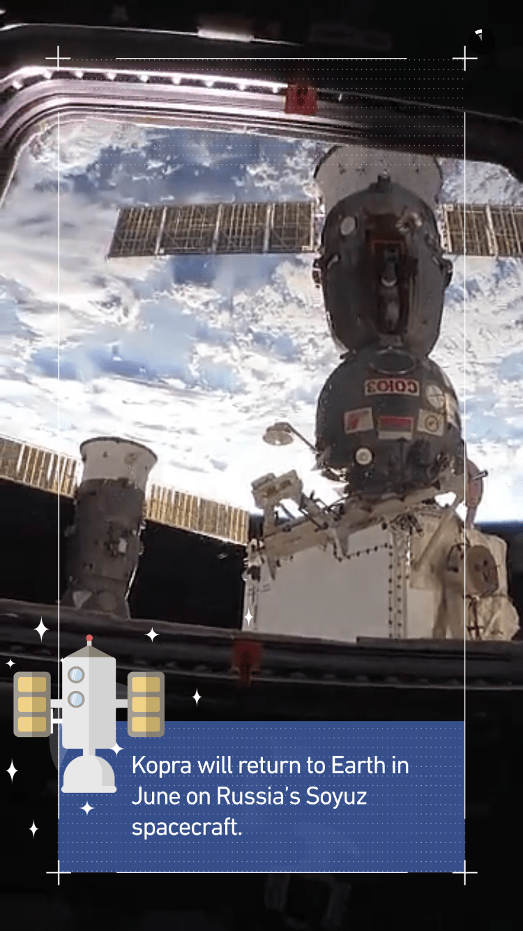 At the end of the Day in Space Story, Kopra shows off the Russian Soyuz vehicle docked to station saying that they are “currently packing it up, getting it ready to go home.” This time next month, Kopra will be preparing to board that vehicle on a trip back to Earth. His ride, the Soyuz TMA-19M, is scheduled to depart from the ISS and land on June 18th.