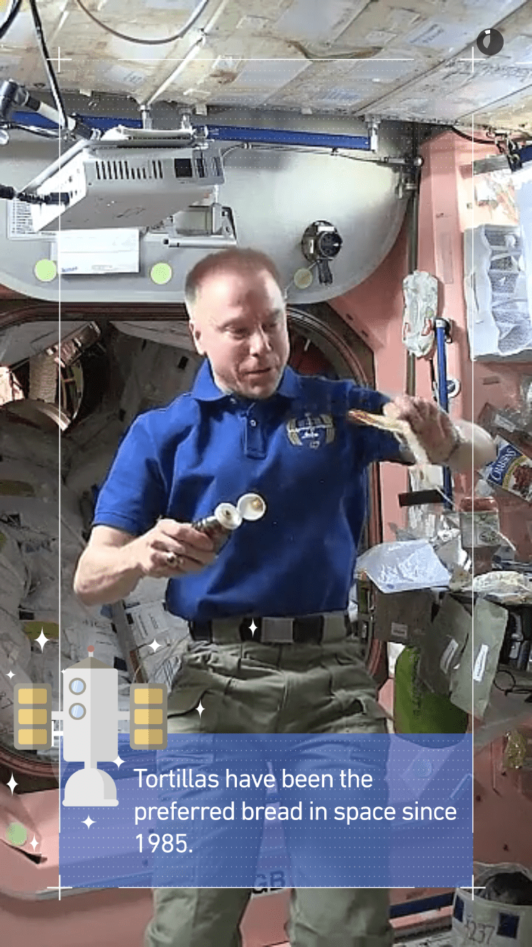 The Live Story features videos of Kopra doing everyday tasks in a weightless environment like flying from one module to another, conducting science experiments with globules of water, eating a tortilla, and doing a mid-air flip.
