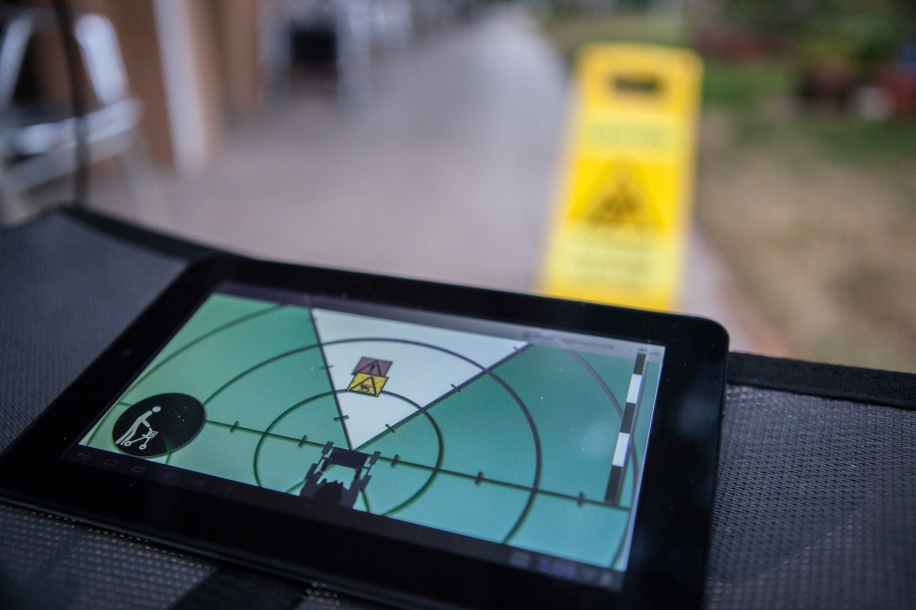 The outward-facing sensors help address problems that arise when a person also has impaired sight or awareness — a break in the sidewalk might not be obvious, but a big yellow caution sign on the screen in front of your face sure is.