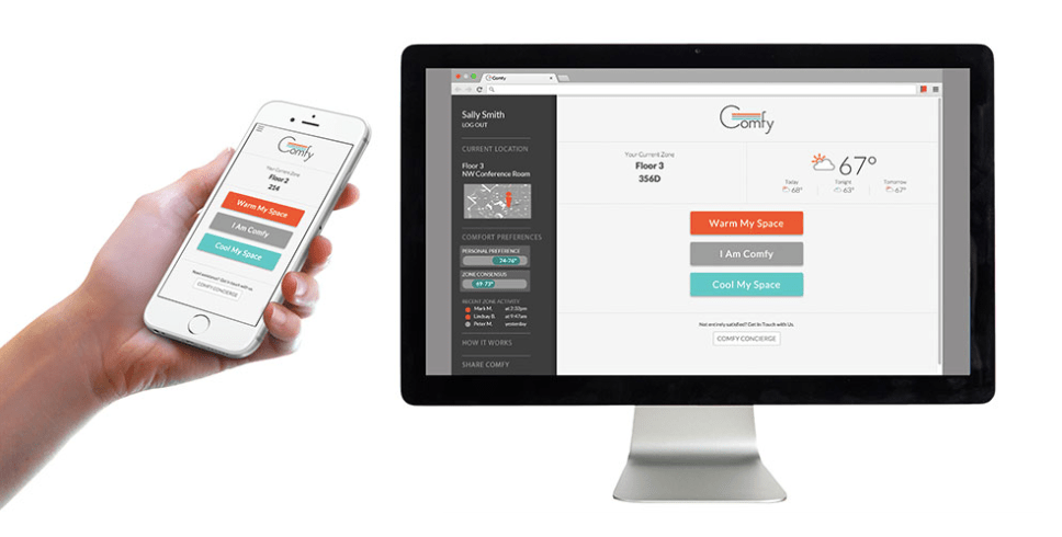 Baker explained that Comfy is a simple-to-use app that employees put on their phones and use to request warm or cool air in a zone where they work. The app uses employee-contributed data, and combines it with usage data and patterns, to tune every zone in an office building based on the routine preferences of people who work in each zone there.