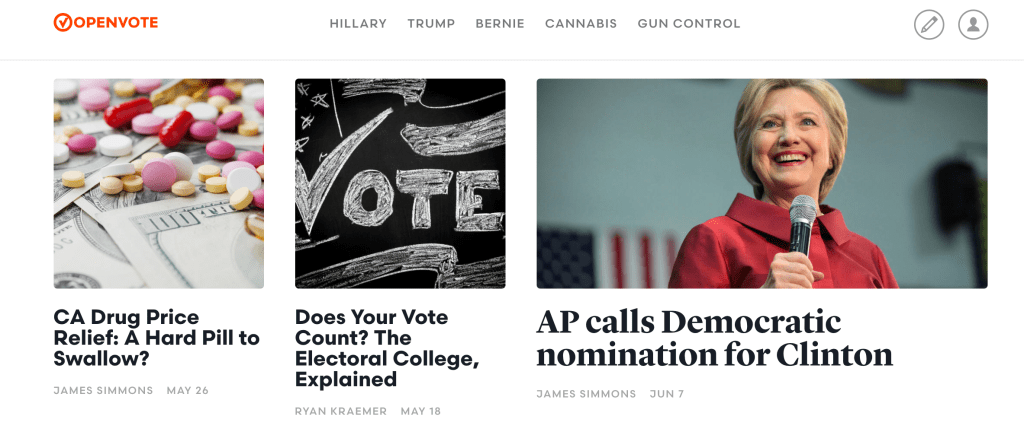 So far, much of the content involves pretty short, fast takes. The top articles are pieces like, “AP calls Democratic nomination for Clinton” or “Are Protestors Helping or Hurting Trump?” Goodlatte said he found interesting the model of Bleacher Report, which relies on user-generated sports content to grow a large-scale media network. However, that company eventually had to add layers of applications processes and trainings to surface higher-quality writers.