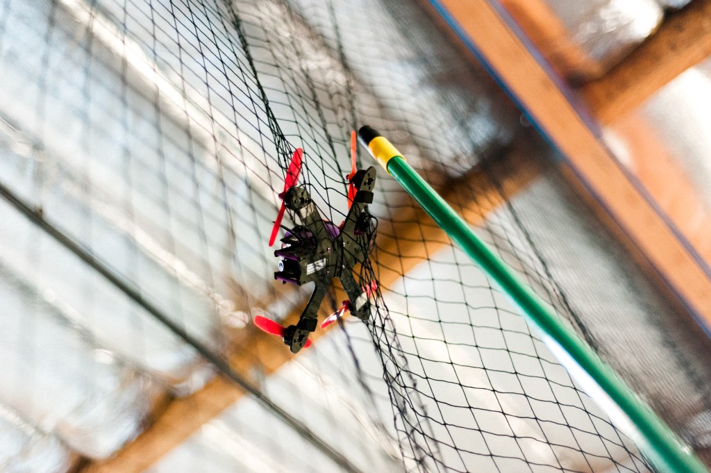 When one drone finds itself caught on protective netting, rescuing it becomes a community endeavor. Races tend to be local affairs where the pilots all know each other. (Image: Ash Ponders)