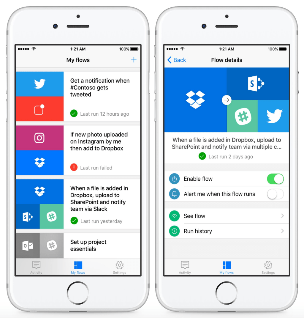 With the new iOS application, you can now manage your previously created “flows” from your smartphone. That means you can switch them on or off, view their properties, or check out run history reports to make sure they are performing properly and haven’t had any errors.