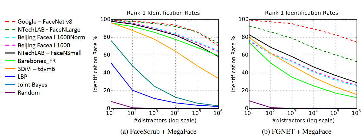 Conspicuously absent is Facebook’s DeepFace, which in all likelihood would be a serious contender. But as participation is voluntary and Facebook hasn’t released its system publicly, its performance on MegaFace remains a mystery.