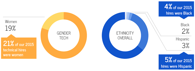 Here’s where the bad news comes in: the overall percentage of black and Hispanic people did not increase at all, with overall representation of blacks remaining at 2% and Hispanics remaining at 3%. In 2015, only 4% of Google’s hires were black and 5% of its hires were Hispanic.