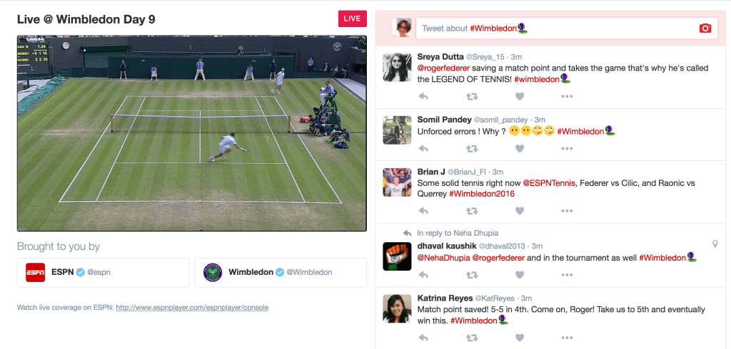 The company began streaming Wimbledon, with coverage beginning on day 9, with the men’s quarterfinals. But tennis fans who also happen to be Twitter users were left in the dark about the new feature. There were no messages about it while logging into the social network, and typing the hashtag #wimbledon only resulted in a plethora of enthusiastic tweets about Roger Federer’s comeback against Marin Cilic.