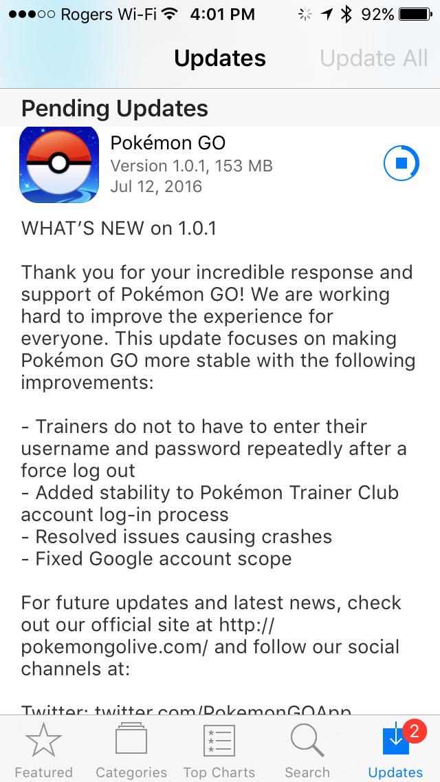 Early reports, including from a source using the 1.01 update via a beta prior to its launch, also suggests that this update improves overall stability. Pokémon Go, while clearly immensely popular, has been prone to issues including random crashes and game state freezes, since its launch last week, so any improvements are definitely welcome.