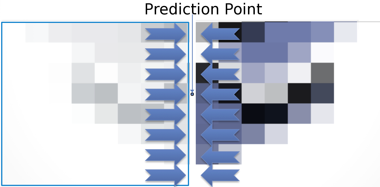 The middle-out bit comes toward the end of the decompression bit. The algorithm looks at the border between two of the 8×8-pixel blocks JPEG creates, where on one side the decoding is already done. The un-decoded side tends to follow a brightness gradient established by that found in the pixels leading up to that middle area, so the algorithm makes a prediction based on that. It then saves only the delta between this prediction and the real value — formatted to be a good fit for the VP8 arithmetic coder.