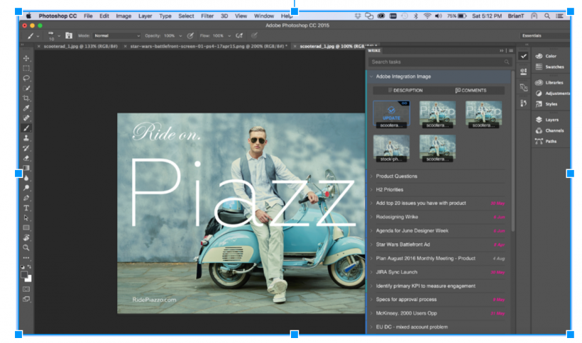 Unsurprisingly, the product was designed around the typical marketing workflow, which often revolves around briefs, requests, assignments, reviews and approvals. The Wrike team also noticed that a lot of the creative work in marketing agencies happens in Adobe tools like Photoshop and InDesign. To integrate these into Wrike, the company built an extension for the Adobe Creative Cloud that brings some of Wrike’s features right into Adobe’s tools.