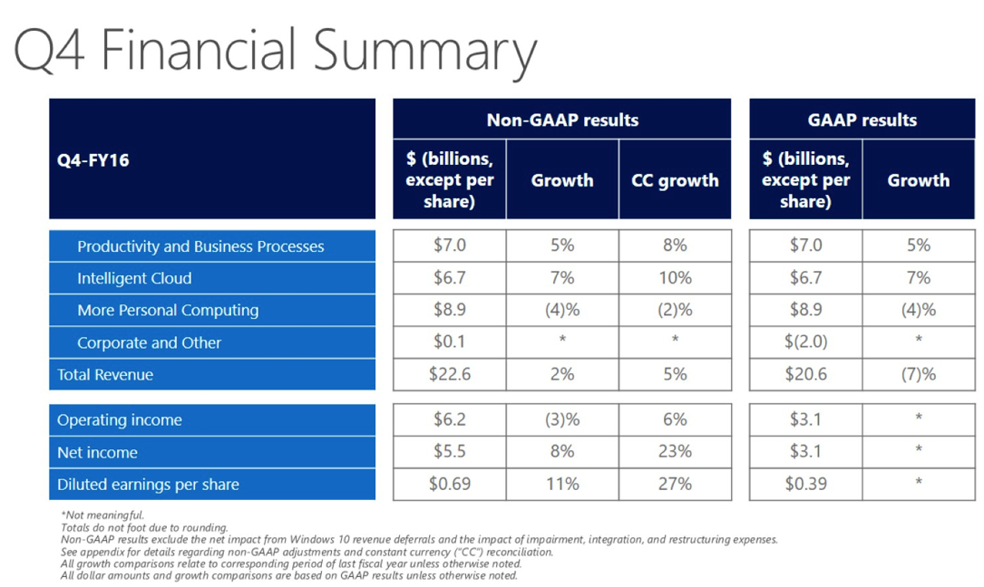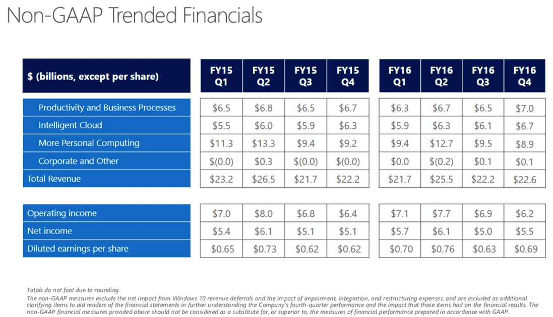 As Microsoft’s director of investor relations Zack Moxcey told me after the earnings announcement, the GAAP results this quarter still reflect the charges Microsoft took related to its phone business and adjustments for Windows 10 revenue deferrals. He also attributed part of Microsoft’s higher than expected earnings to the company’s lower than expected tax rate.