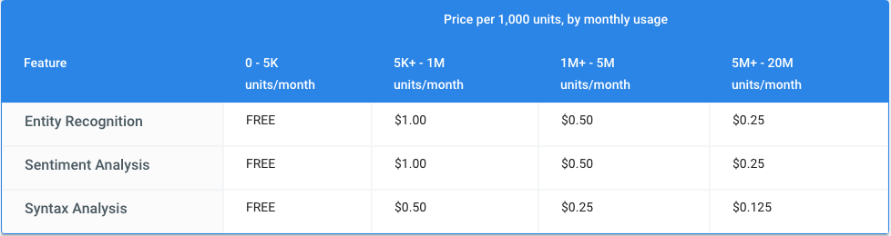 Pricing for using the Natural Language APIs depends on which one of the three different services you are using and how many records you plan to analyze. Here is Google’s pricing chart: