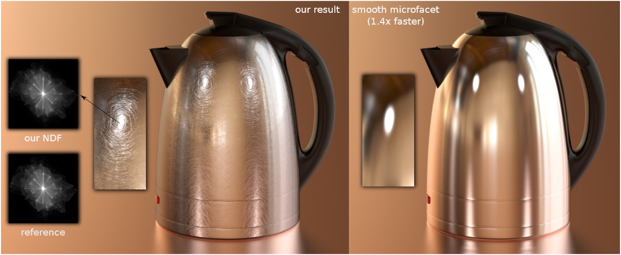 Using this “position-normal distribution” technique produces a highly accurate representation of speculars — and because the renderer is spared the trouble of checking how every ray of light interacts with every tiny scratch or bump, it’s far faster as well.
